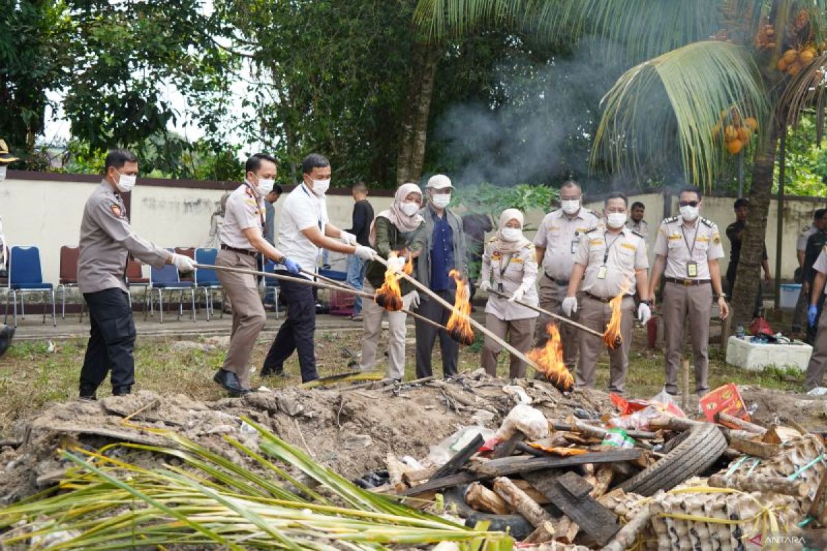 Barang bukti yang dimusnahkan di antaranya 1.650 kilogram telur konsumsi, 480 kilogram kulit sapi, 3.000 kilogram jeroan ayam, 38,80 kilogram daging babi, 6,96 kilogram daging babi olahan, 3,22 kilogram dendeng babi, 8,24 kilogram sosis babi, 0,98 kilogram kerupuk babi, 3,745 kilogram bakso babi serta 2 kilogram kornet.