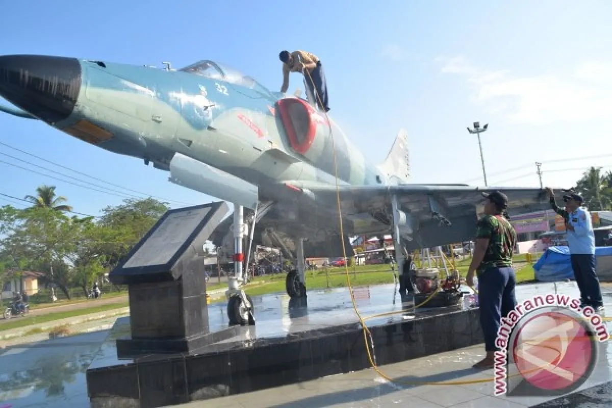Pontianak (Antara Kalbar) - Personel Pangkalan TNI AU Supadio membersihkan tugu pesawat A-4 Skyhawk yang terletak di Taman Dirgantara Kubu Raya, Kamis (19/1).