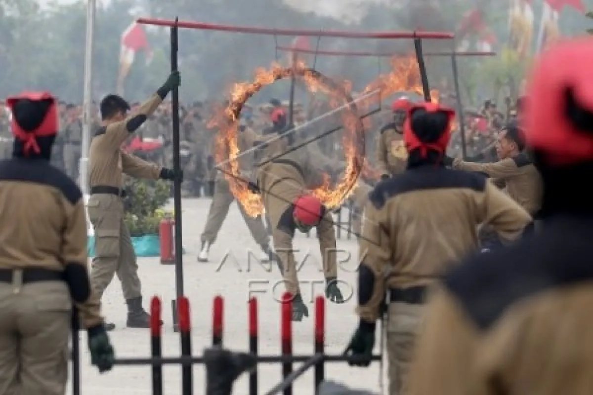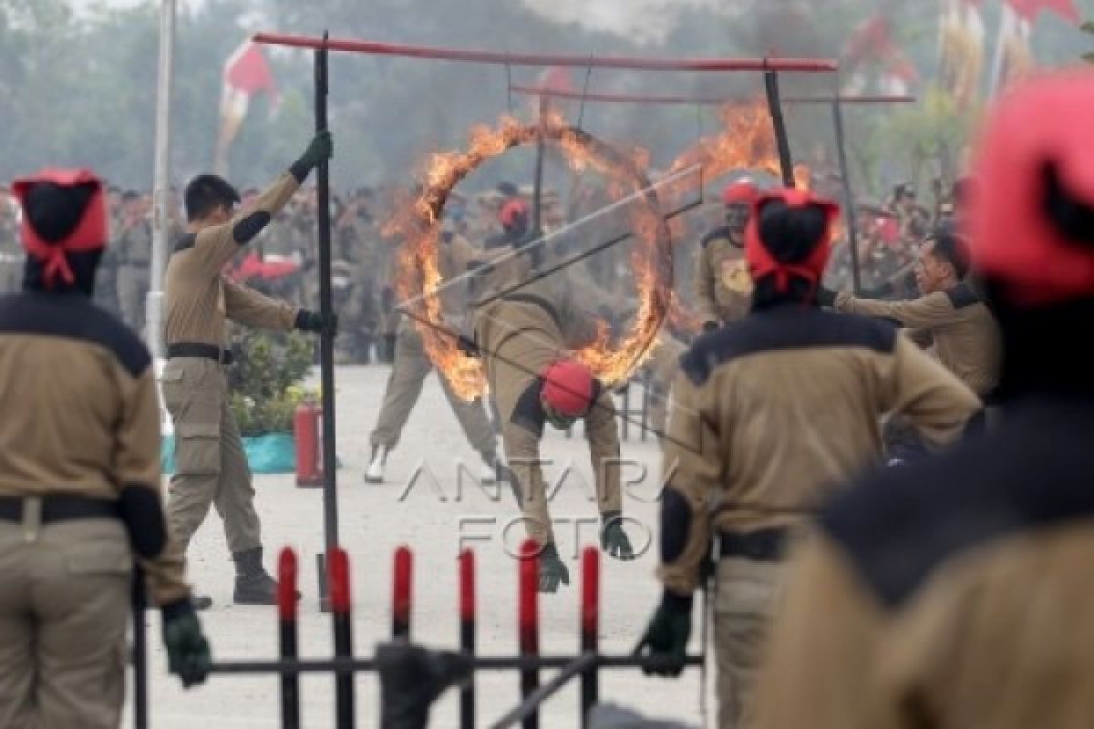 1Sejumlah anggota Satpol PP melakukan atraksi dengan melompati lingkaran api seusai upacara pembukaan Jambore Nasional Polisi Pamong Praja (Pol-PP) II Tahun 2015 di Lapangan Parkir Venue Tembak, Jakabaring Sport City (JSC), Palembang, Sumsel. Jumat (9/10). Kegiatan tersebut diikuti 1.500 anggota Satpol PP Provinsi dan Kab/Kota se-Indonesia. ANTARA FOTO/Nova Wahyudi/aww/15.