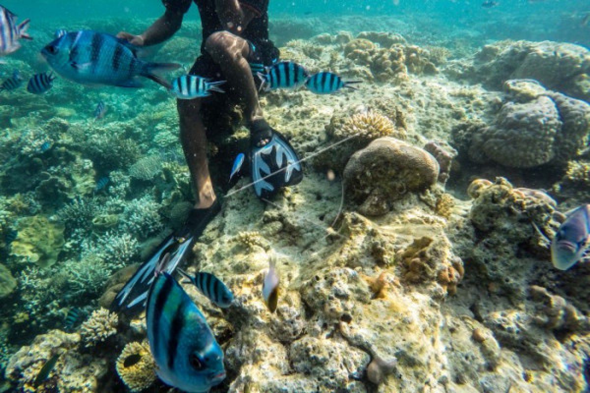 Wisatawan menginjak terumbu karang di perairan Kepulauan Karimunjawa di Jepara, Jawa Tengah, Selasa (31/10). Meski pemandu wisata telah mengimbau dan melarang wisatawan untuk tidak menginjak terumbu karang yang dapat merusak ekosistem bawah laut di perairan konservasi kepulauan tersebut tapi sejumlah wisatawan tidak mematuhi peraturan itu. ANTARA FOTO/Aji Styawan/aww/17.