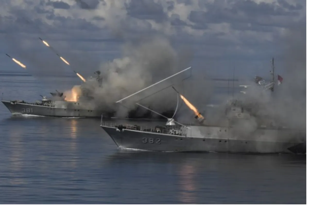 Dua kapal perang TNI AL KRI Hasan Basri 382 (kanan) dan KRI Tjiptadi 381 (kiri) menembakkan roket pada latihan gabungan peperangan anti kapal selam di Kepulauan Riau, Minggu (24/10/2021). Pada latihan tersebut ditampilkan tiga jenis peperangan aspek laut diantaranya peperangan anti udara, peperangan anti kapal permukaan dan peperangan anti kapal selam guna meningkatkan kemampuan tempur pasukan TNI AL. ANTARA FOTO/ Fakhri Hermansyah/rwa.