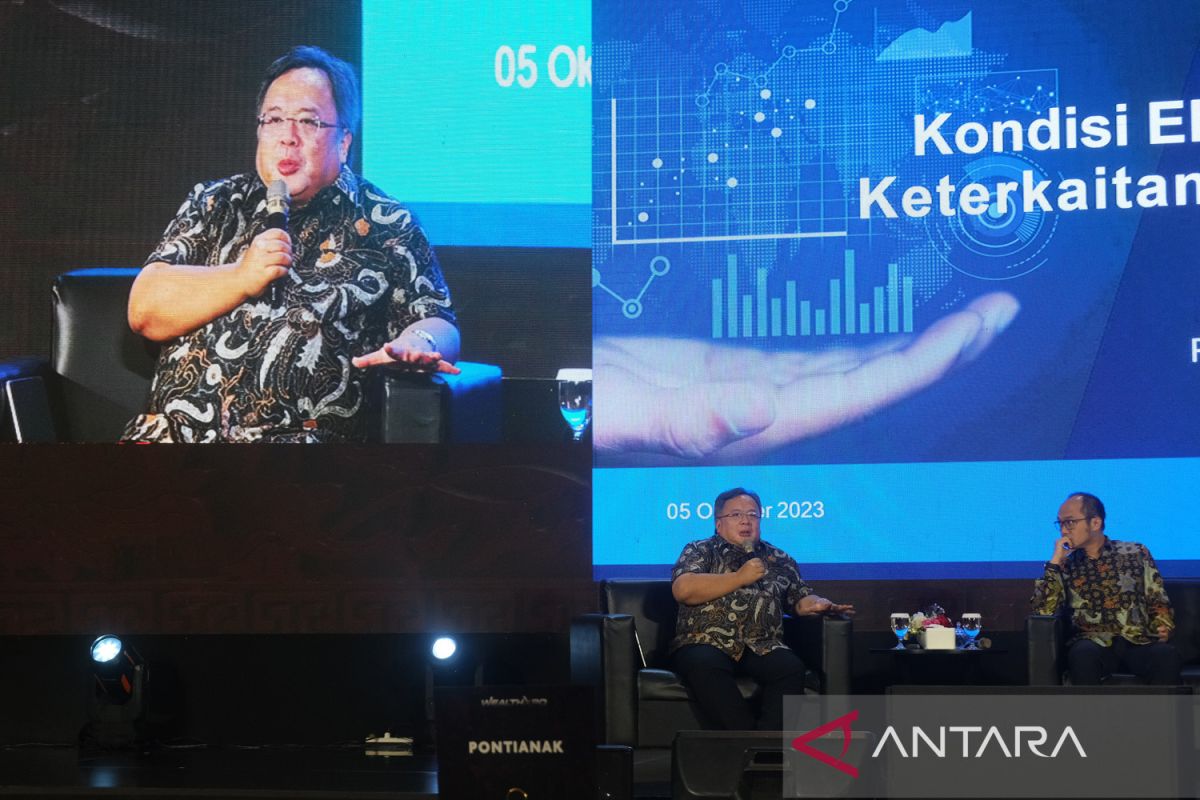 Senior Economist sekaligus Menteri Keuangan periode 2014-2016 Bambang Brodjonegoro (kiri) berbicara dalam perhelatan Wealth Xpo di Kabupaten Kubu Raya, Kalimantan Barat, Kamis (5/10/2023). Dalam acara Wealth Xpo yang bertajuk The Resilience of Indonesia’s Economy in the Political Year 2024 dan diselenggarakan CIMB Niaga untuk nasabah istimewa CIMB Preferred tersebut berbagi insight baru tentang pengelolaan keuangan, proteksi dan investasi di tengah dinamika ekonomi politik global dan nasional menjelang tahun Pemilu pada 2024 mendatang. ANTARA KALBAR/Jessica Wuysang.