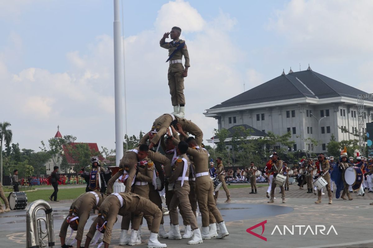 Sejumlah Praja IPDN menggelar atraksi Drum Band Gita Abdi Praja IPDN Kalbar pada acara peringatan Sumpah Pemuda di Kantor Gubernur Kalimantan Barat di Pontianak, Kalbar, Senin (28/10/2024). Acara peringatan Hari Sumpah Pemuda yang dimeriahkan dengan tarian tiga etnis Kalbar, aksi drum band dan lainnya tersebut untuk memberikan inspirasi semangat persatuan dan kesatuan pemuda-pemudi Indonesia. Antara Kalbar/Victorya Fernando/Jhw