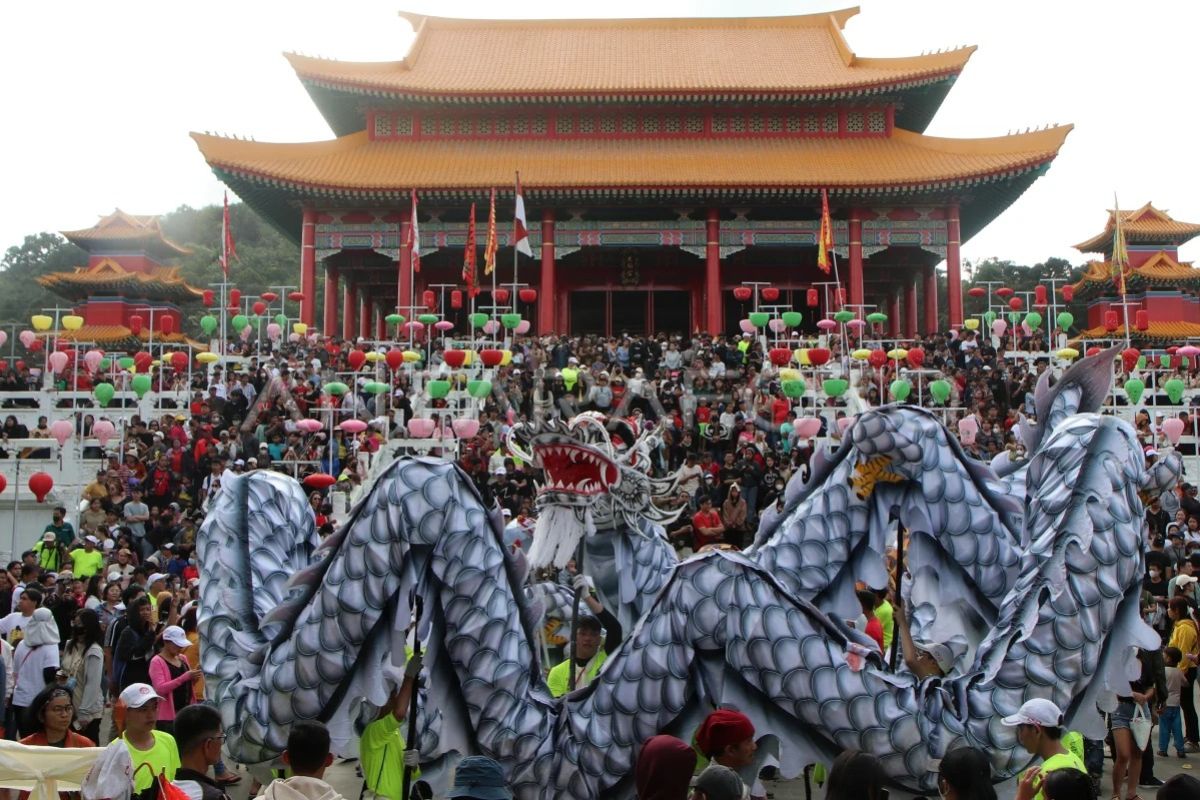 Sebuah replika liong naga diarak sebelum dibakar di Wihara Tri Dharma Sui Kheu Thai Pak Kung di Kota Singkawang, Kalimantan Barat, Rabu (12/2/2025). Sebanyak sembilan naga yang telah diarak keliling kota dan mendatangi rumah-rumah warga Tionghoa untuk menolak bala serta mengusir roh jahat tersebut dibakar untuk menandai akhir dari perayaan Cap Go Meh di Kota Singkawang. ANTARA FOTO/Jessica Wuysang/nym.