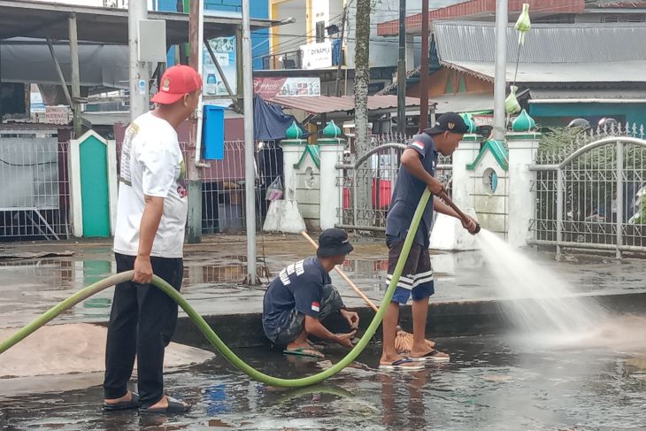 Sambas (ANTARA) - Menjelang hari raya Idul Fitri 1446 Hijriah, Badan Pemadam Kebakaran (BPK) Sambas menurunkan empat unit mobil pemadam untuk membersihkan halaman Masjid Agung Babul Jannah.