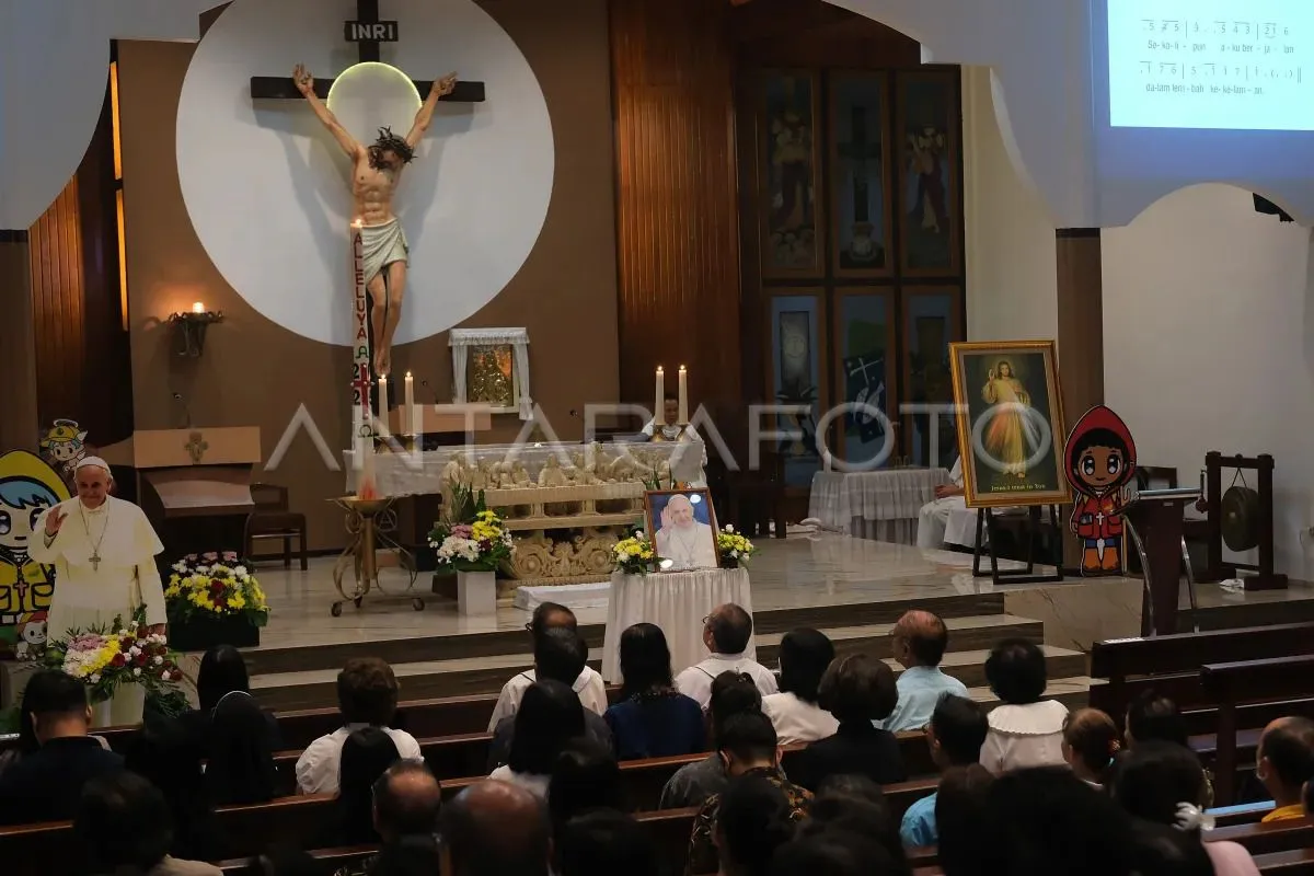 Umat Katolik mengikuti Misa Arwah atau Misa Requiem di Gereja Gembala Baik, Pontianak, Kalimantan Barat, Jumat (25/4/2025). Misa tersebut digelar sebagai bentuk penghormatan sekaligus untuk mendoakan arwah Bapa Suci Paus Fransiskus agar dianugerahi kedamaian abadi dalam Kerajaan Surga. ANTARA FOTO/Jessica Wuysang/Spt.