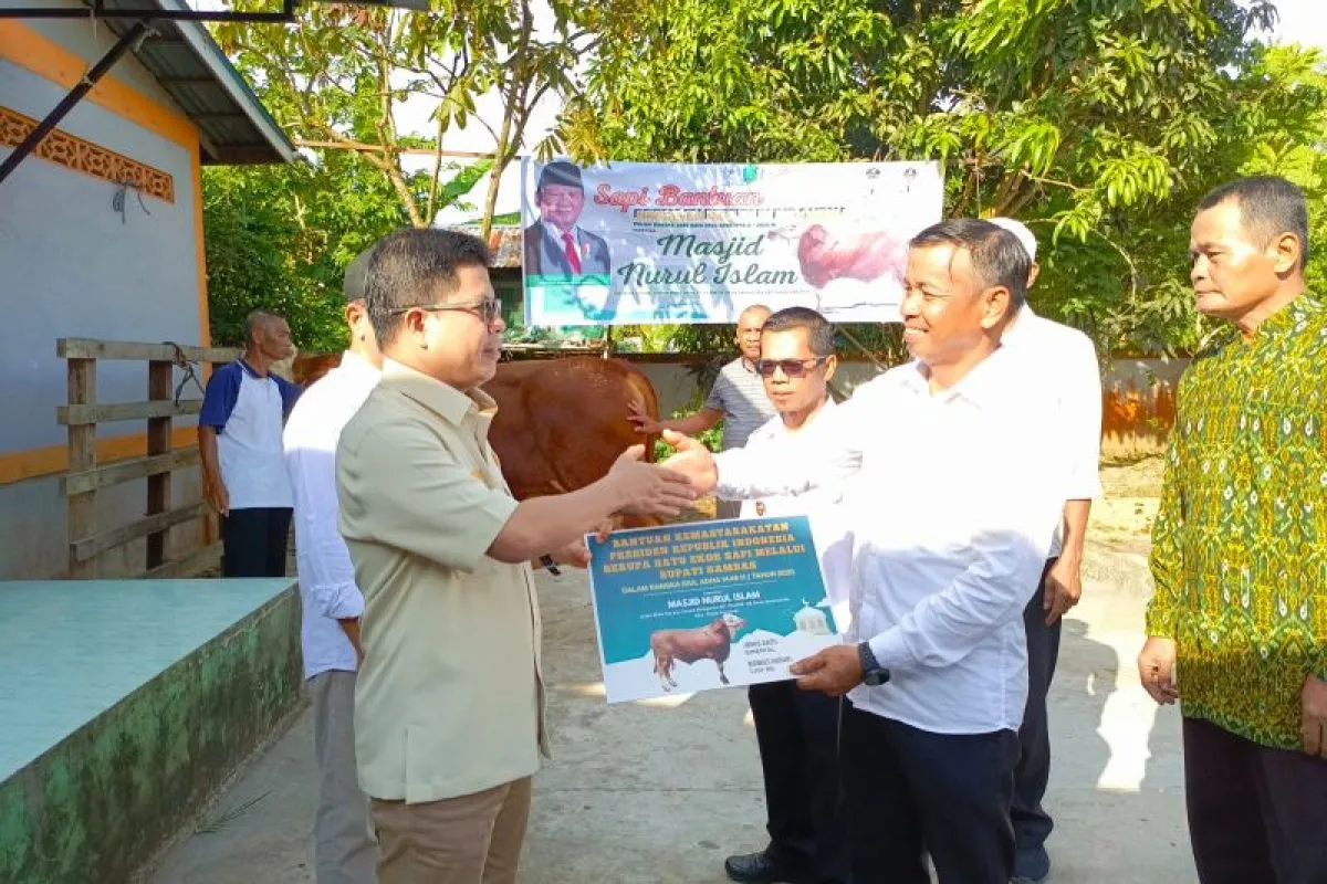 Pontianak (ANTARA) - Bupati Sambas, Satono menyerahkan sapi kurban Idul Adha 1446 H dari Presiden Prabowo Subianto untuk warga Kabupaten Sambas khususnya Desa Samustida Kecamatan Teluk Keramat.