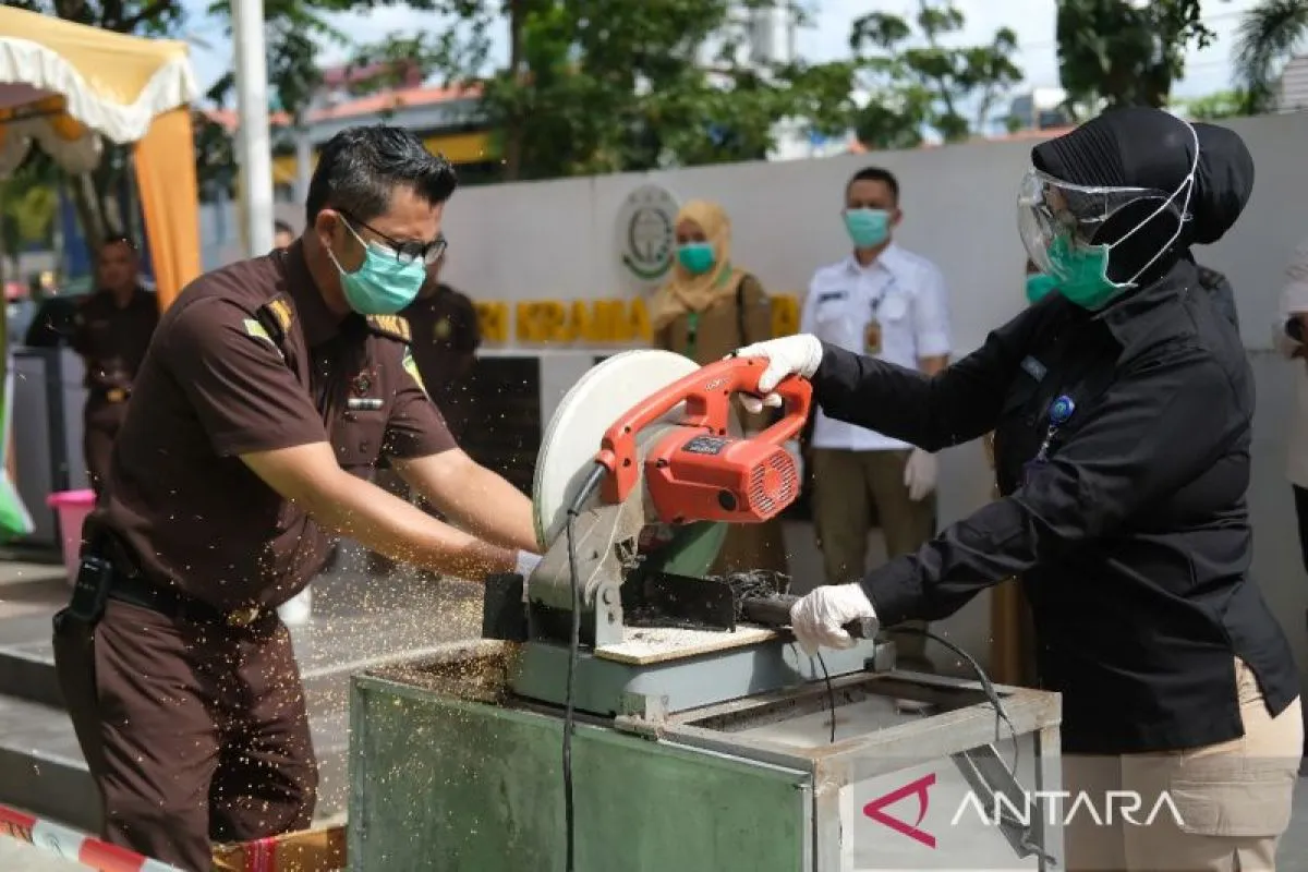 Kepala BNN Kota Pontianak Anida Sari (kanan) didampingi petugas Kejari memotong senjata tajam menggunakan mesin dalam kegiatan pemusnahan barang bukti di Kantor Kejaksaan Negeri Pontianak, Kalimantan Barat, Selasa (24/6/2025). Kejaksaan Negeri Pontianak memusnahkan sejumlah barang bukti berupa kosmetik dan obat herbal ilegal, senjata tajam, telepon genggam, pakaian dan narkotika dari 101 perkara yang telah berkekuatan hukum tetap (inkracht), yang mencakup tindak pidana Orang dan Harta Benda (Oharda), Tindak Pidana Umum Lainnya (TPUL), kepabeanan serta narkotika dan zat adiktif lainnya. ANTARA FOTO/Jessica Wuysang