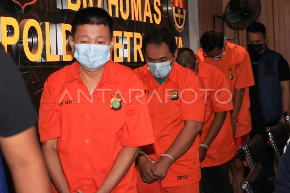 Empat tersangka kasus manipulasi data pribadi melalui penjualan kartu SIM perdana telepon seluler berjalan saat konferensi pers di Mapolda Metro Jaya, Jakarta, Jumat (25/7/2025). Polda Metro Jaya menetapkan empat tersangka, antara lain IER, KK, F, dan FRR atas kasus kejahatan manipulasi data pribadi dan penyalahgunaan kartu SIM yang telah teregistrasi secara ilegal. ANTARA FOTO/Reno Esnir/app/tom.