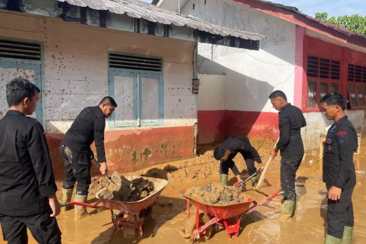 Medan (ANTARA) - Personel Satuan Brimob Kepolisian Daerah Sumatera Utara membersihkan sekolah dasar (SD) yang terdampak banjir di Kecamatan Tukka, Kabupaten Tapanuli Tengah (Tapteng).