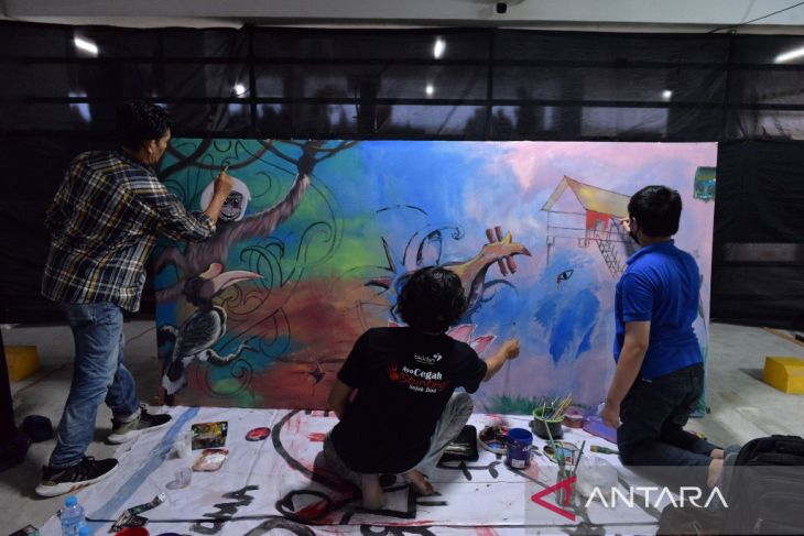 Tiga perupa Kalbar melukis bersama dalam kegiatan Pameran Etalase Seni - Loka Kordial di Pontianak, Kalimantan Barat, Minggu (9/7/2023). Pameran yang merupakan kolaborasi Oikos Nomos, Siberdaya, Imagi Rupa, Emeh Deyeh dan Stasiun Terbang tersebut menampilkan 50 karya seni visual yang mengusung isu sosial, budaya dan lingkungan. ANTARA FOTO/Jessica Wuysang