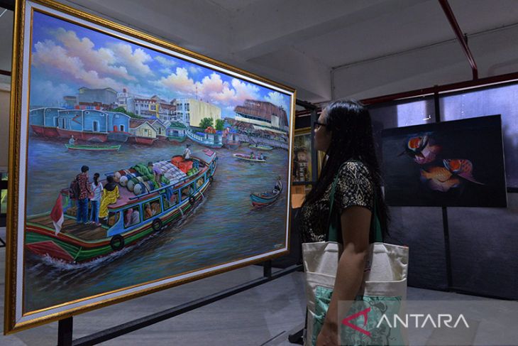 Pameran Karya Seni Perupa Kalimantan Barat. Seorang pengunjung mengamati karya lukis yang ditampilkan dalam Pameran Etalase Seni - Loka Kordial di Pontianak, Kalimantan Barat, Minggu (9/7/2023). Pameran yang merupakan kolaborasi Oikos Nomos, Siberdaya, Imagi Rupa, Emeh Deyeh dan Stasiun Terbang tersebut menampilkan 50 karya seni visual yang mengusung isu sosial, budaya dan lingkungan. ANTARA FOTO/Jessica WuysangJESSICA HELENA WUYSANG/JESSICA HELENA WUYSANG (JESSICA HELENA WUYSANG/JESSICA HELENA WUYSANG)