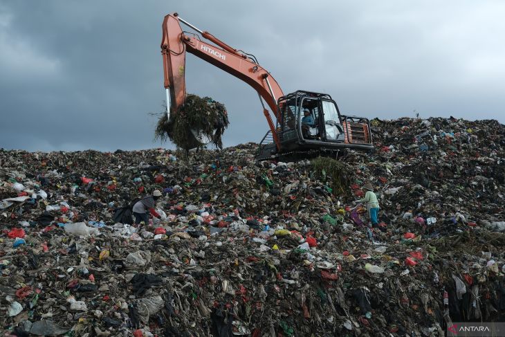 Tempat Pembuangan Akhir di Pontianak. Dua pemulung memilah sampah di bawah alat berat eskavator yang sedang meratakan tumpukan sampah di Tempat Pembuangan Akhir (TPA) Batulayang, Pontianak, Kalimantan Barat, Minggu (18/5/2025). Pemerintah Kota Pontianak mencatat TPA Batulayang yang berada di atas lahan gambut seluas 20 hektar dengan kedalaman mencapai 18 meter tersebut menampung sekitar 400 ton sampah setiap hari. ANTARA FOTO/Jessica Wuysang.