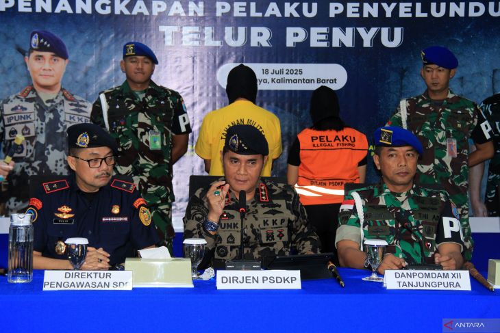 KKP tangkap penyelundup telur penyu di Kalbar. Dirjen Pengawasan Sumber Daya Kelautan dan Perikanan Pung Nugroho Saksono (tengah) didampingi Danpomdam XII/Tanjungpura Kolonel CPM Dermawan Agus Irianto (kanan) dan Direktur Pengawasan Sumber Daya Perikanan (PSDP) Halid K Jusuf (kiri) memberikan keterangan pers di Stasiun PSDKP Pontianak di Sungai Rengas, Kabupaten Kubu Raya, Kalimantan Barat, Jumat (18/7/2025). Kementerian Kelautan dan Perikanan (KKP) menangkap dua pelaku penyelundupan 5.400 butir telur penyu di Pelabuhan Sintete, Kabupaten Sambas, Kalimantan Barat pada pekan lalu, yakni seorang personel aktif TNI AD berinisial SD dan seorang warga sipil berinisial MU, yang terindikasi terhubung dengan jaringan perdagangan ilegal internasional di Malaysia. ANTARA FOTO/Jessica Wuysang/bar