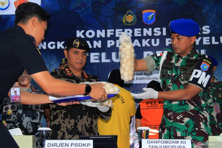 KKP tangkap penyelundup telur penyu di Kalbar. Dirjen Pengawasan Sumber Daya Kelautan dan Perikanan Pung Nugroho Saksono (kedua kiri) bersama Danpomdam XII/Tanjungpura Kolonel CPM Dermawan Agus Irianto (kanan) memperlihatkan barang bukti telur penyu dalam konferensi pers di Stasiun PSDKP Pontianak, Sungai Rengas, Kabupaten Kubu Raya, Kalimantan Barat, Jumat (18/7/2025). Kementerian Kelautan dan Perikanan (KKP) menangkap dua pelaku penyelundupan 5.400 butir telur penyu di Pelabuhan Sintete, Kabupaten Sambas, Kalimantan Barat pada pekan lalu, yakni seorang personel aktif TNI AD berinisial SD dan seorang warga sipil berinisial MU, yang terindikasi terhubung dengan jaringan perdagangan ilegal internasional di Malaysia. ANTARA FOTO/Jessica Wuysang/bar