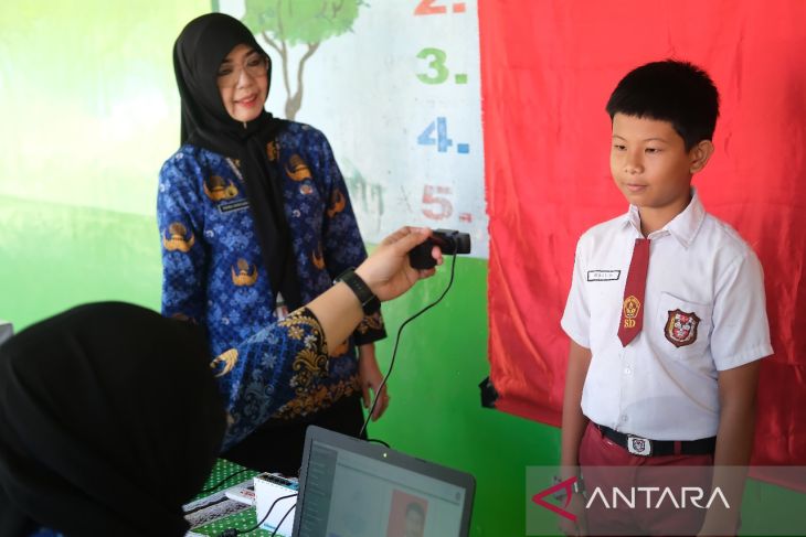 Petugas Disdukcapil Kota Pontianak merekam data pelajar SD untuk pembuatan Kartu Identitas Anak (KIA) dalam layanan jemput bola di Sekolah Dasar Negeri (SDN) 10 Pontianak Utara, Kalimantan Barat, Selasa (20/5/2025). Sebanyak 118.557 anak atau 63,45 persen dari total anak di Kota Pontianak telah memiliki Kartu Identitas Anak (KIA) melalui program Pelayanan Cetak Kartu Identitas Anak Sehari Jadi (PECI HAJI) yang menyasar anak usia sekolah dengan sistem jemput bola di sekolah maupun di ruang publik. ANTARA FOTO/Jessica Wuysang