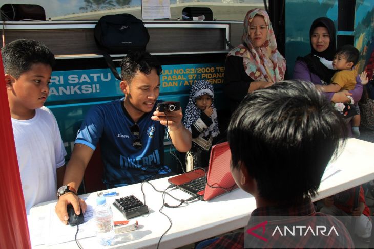 Petugas Disdukcapil Kota Pontianak merekam data anak untuk pembuatan Kartu Identitas Anak (KIA) melalui layanan jemput bola di area Car Free Day (CFD) Pontianak, Kalimantan Barat, Minggu (13/7/2025). Sebanyak 118.557 anak atau 63,45 persen dari total anak di Kota Pontianak telah memiliki Kartu Identitas Anak (KIA) melalui program Pelayanan Cetak Kartu Identitas Anak Sehari Jadi (PECI HAJI) yang menyasar anak usia sekolah dengan sistem jemput bola di sekolah maupun di ruang publik. ANTARA FOTO/Jessica Wuysang